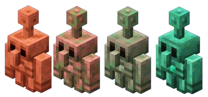 Comme les blocs de cuivre, le Golem de Cuivre passe par quatre stades d'oxydation jusqu'à devenir une statue immobile.