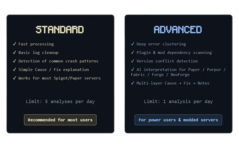 MCDoctor.ai met fin à ce cauchemar. Propulsé par une IA entraînée spécifiquement sur les logs Minecraft, cet outil analyse votre fichier latest.log instantanément et fournit un diagnostic clair et des solutions précises.