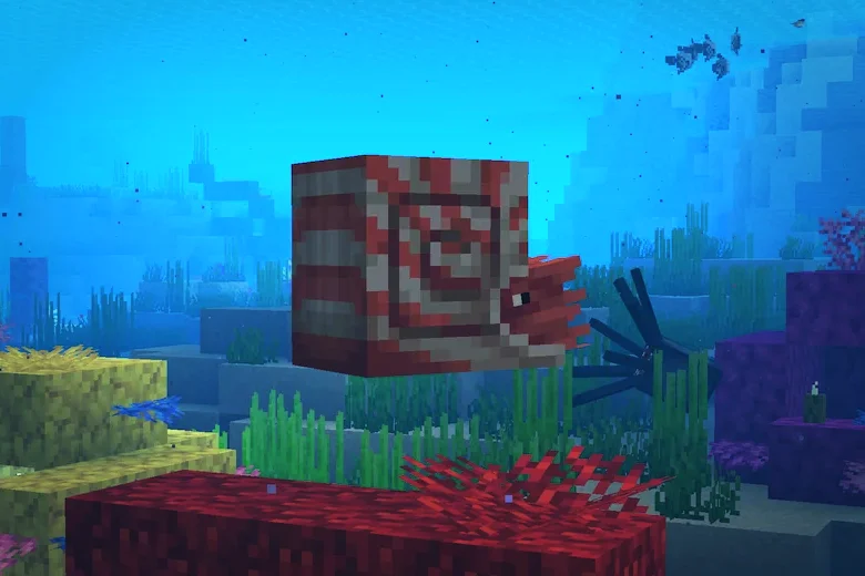 Zombie Nautilus : Mob aquatique hostile monté par un Noyé (Drowned) armé d'un Trident. Une variante "Corail" apparaît dans les Océans Chauds.