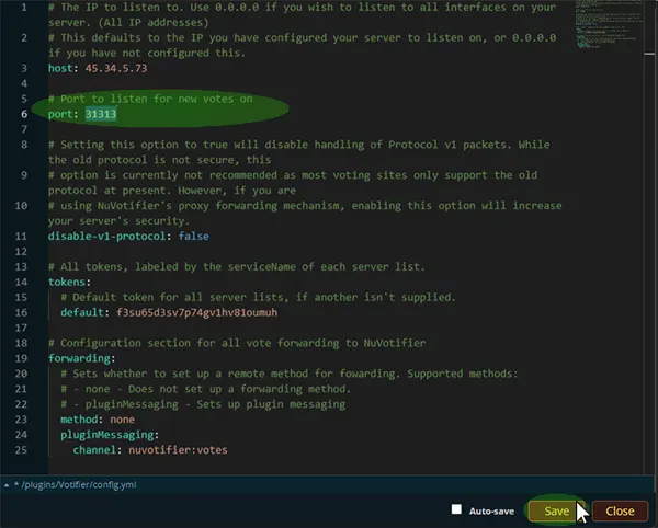 Accédez au fichier /plugins/NuVotifier/config.yml et modifiez les paramètres suivants :